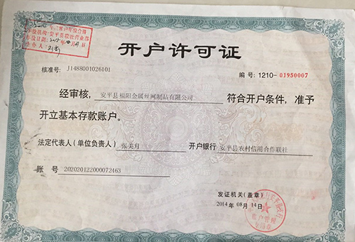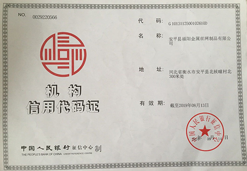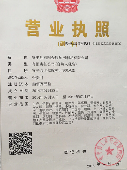 您當(dāng)前位置:建筑網(wǎng)片/安平護(hù)欄網(wǎng)廠家/電焊網(wǎng)/不銹鋼網(wǎng)/金鋼網(wǎng)-安平縣福陽(yáng)金屬絲網(wǎng)制品有限公司 > 資質(zhì)證書